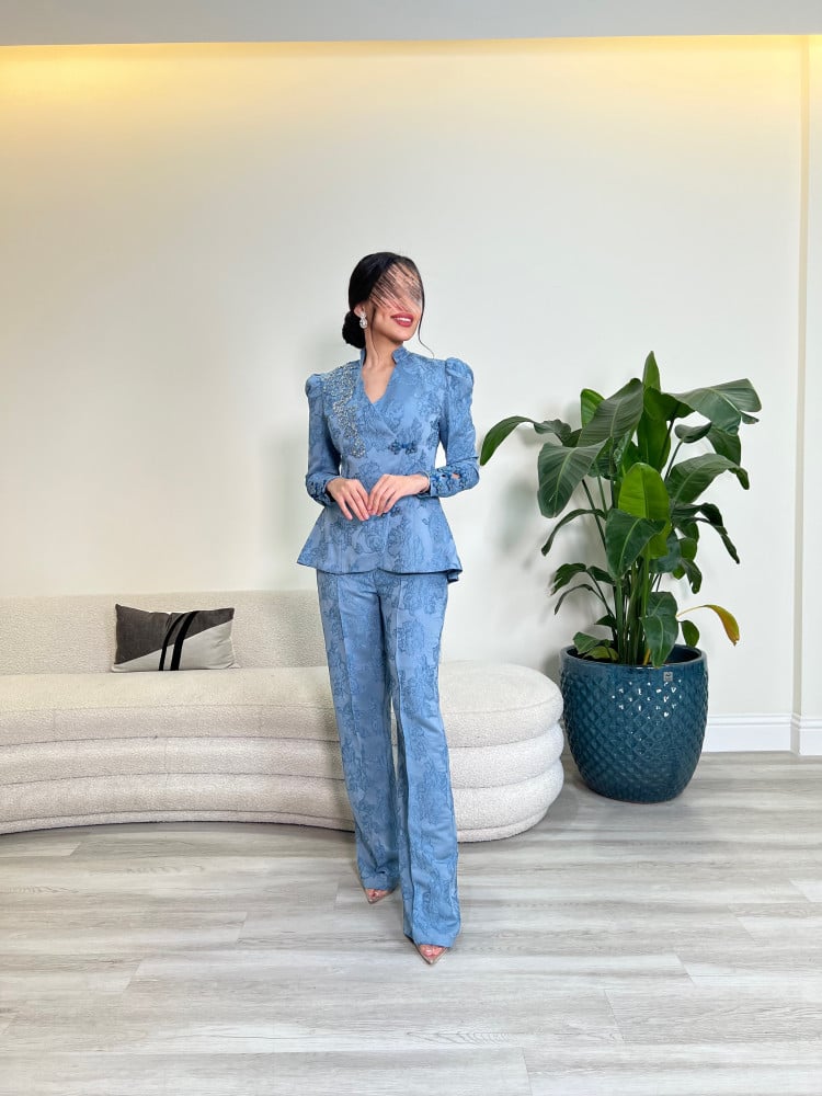 طقم بليزر وبنطلون سماوي بجيوب مخفيه وخرز على الصدر